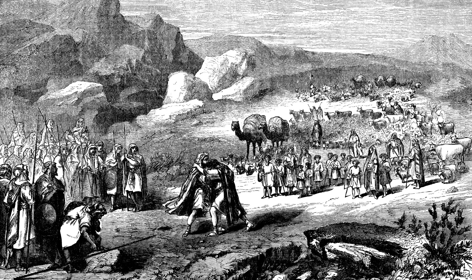 Schließlich kommt es zum entscheidenden Wiedersehen am Fluss Jabbok. Mit Geschenken und respektvollem Auftreten versucht Jakob, das Wohlwollen Esaus zu gewinnen. Esau erkennt Jakobs Reue. Statt Vergeltung folgen Kuss und Umarmung. Die Geschichte macht deutlich: Wer Verantwortung für eigenes Fehlverhalten übernimmt, dem kann ein Neuanfang geschenkt werden.